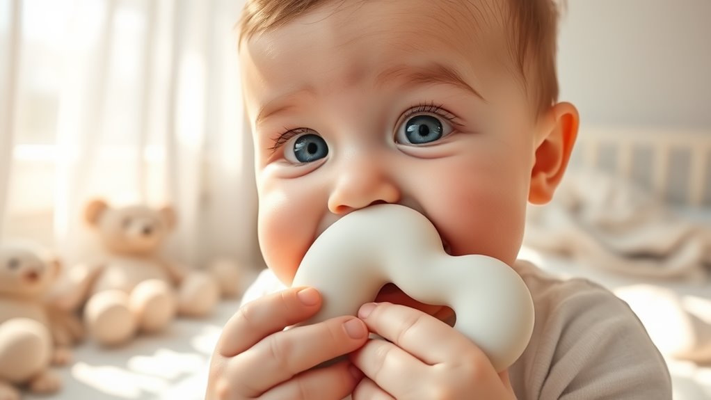When your baby’s teething, gentle relief is key. Look for natural teething toys made from organic materials that are safe and soothing. Soft finger massages on their gums can provide comfort, and warm compresses can relax tense muscles. Create a calming environment with soft music and dim lighting to ease their stress. It’s essential to monitor symptoms closely—if concerns arise, don’t hesitate to consult a pediatrician. Explore further to discover more effective ways to support your little one.