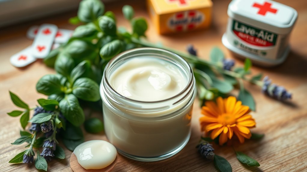 Start with a base of coconut oil or shea butter, which moisturizes and nourishes the area. Next, add beeswax to thicken the mixture and create a barrier against dirt. Incorporate essential oils like lavender or tea tree oil for their antibacterial properties. Lastly, consider adding vitamin E oil for its healing benefits. These components come together to form a natural wound ointment that soothes, protects, and aids in recovery, making it perfect for your first aid kit. Additionally, natural ingredients can significantly enhance the healing process by providing essential nutrients and anti-inflammatory effects.