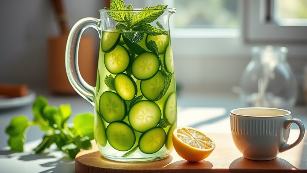 To kickstart your day, consider establishing a morning hydration ritual that includes a glass of water or herbal tea right after you wake up. Incorporating immune-boosting drinks can also help strengthen your body’s defense system. Pair this with a nutrient-dense breakfast, like a smoothie loaded with greens and protein, to fuel your body effectively. Incorporating metabolism-boosting drinks into your routine can further enhance your energy and fat-burning results. These simple habits not only support your detox efforts but also enhance your overall well-being throughout the day.