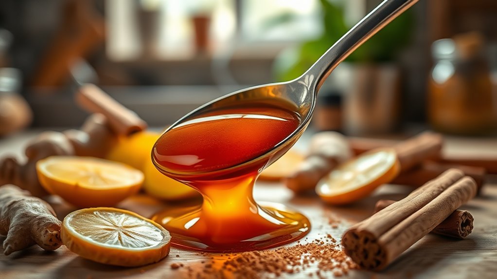 Don’t forget lemon; its immune-boosting properties help you fight off illness while easing that irritating cough. Additionally, turmeric provides anti-inflammatory properties that enhance the effectiveness of this soothing remedy.