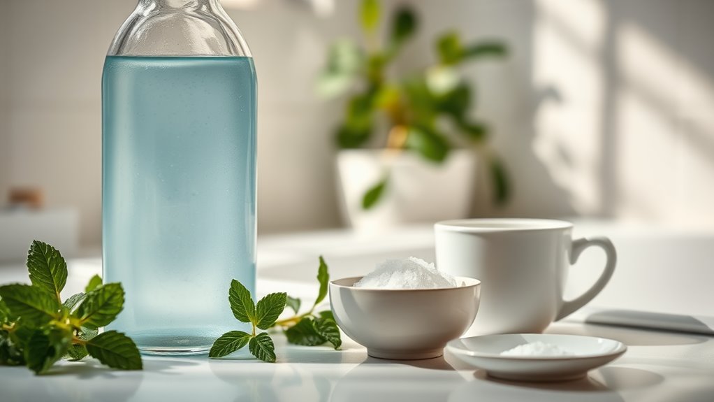 Creating an effective mouth rinse for canker sores involves selecting the right combination of ingredients. You’ll want to gather the following essential components to guarantee your rinse is both soothing and effective: